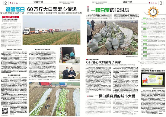 根據(jù)本次”愛心助農(nóng) 溫暖冬季“公益活動相關(guān)規(guī)劃,企業(yè)購買的60萬斤大白菜將分批發(fā)放到青島市內(nèi)四區(qū)以及濟(jì)南、淄博、東營、珠海、澳門共計(jì)40家福利院養(yǎng)老院。